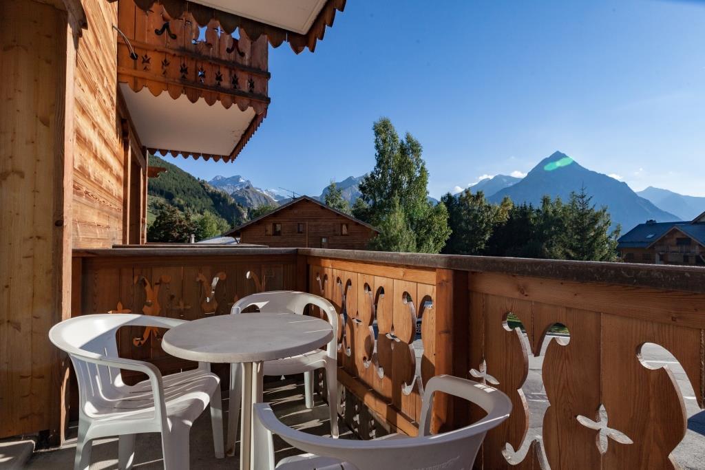 Au premier étage d'un grand chalet ( 5 appartements ), il a un balcon de 6 m² orienté Sud-Ouest face à la Muzelle avec une très jolie vue.